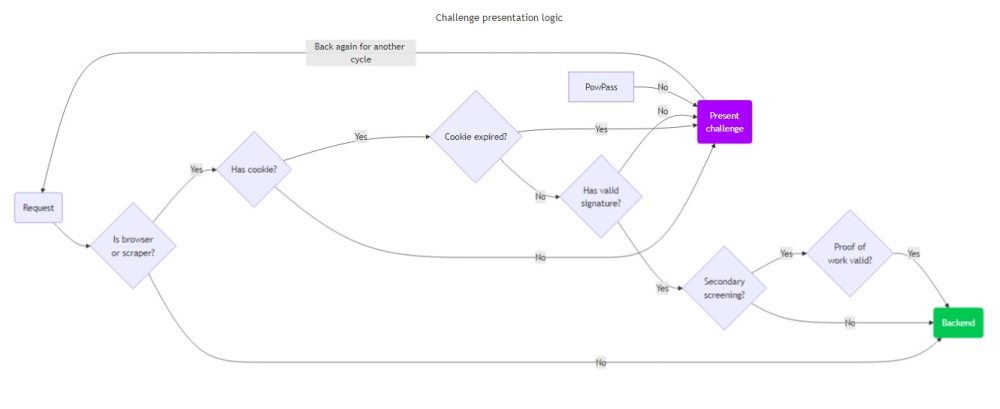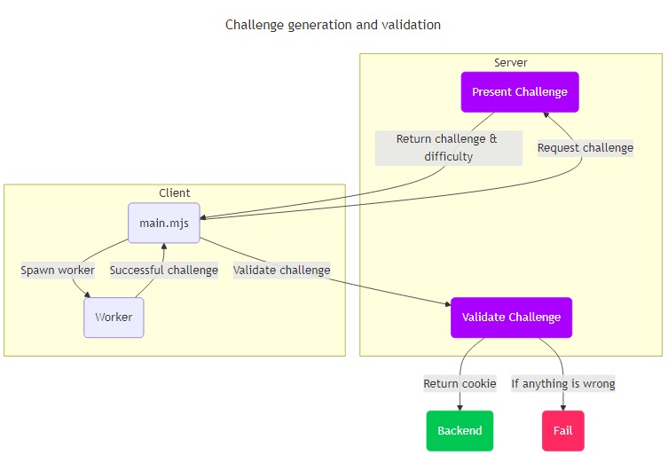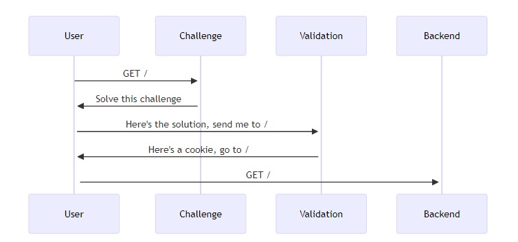 当 Anubis 被配置为使用 “快 ”或 “慢 ”挑战方法时,客户端将收到一个小的工作证明 挑战。为了获得用于访问上游资源的令牌,客户端必须用 JavaScript 计算一个复杂的数学谜题。