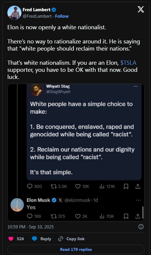 文章引述马斯克“白人应夺回自己的国家”的表述有误。虽知非本意且注明引自弗雷德帖文,但表述仍需更清晰。敬请指正。