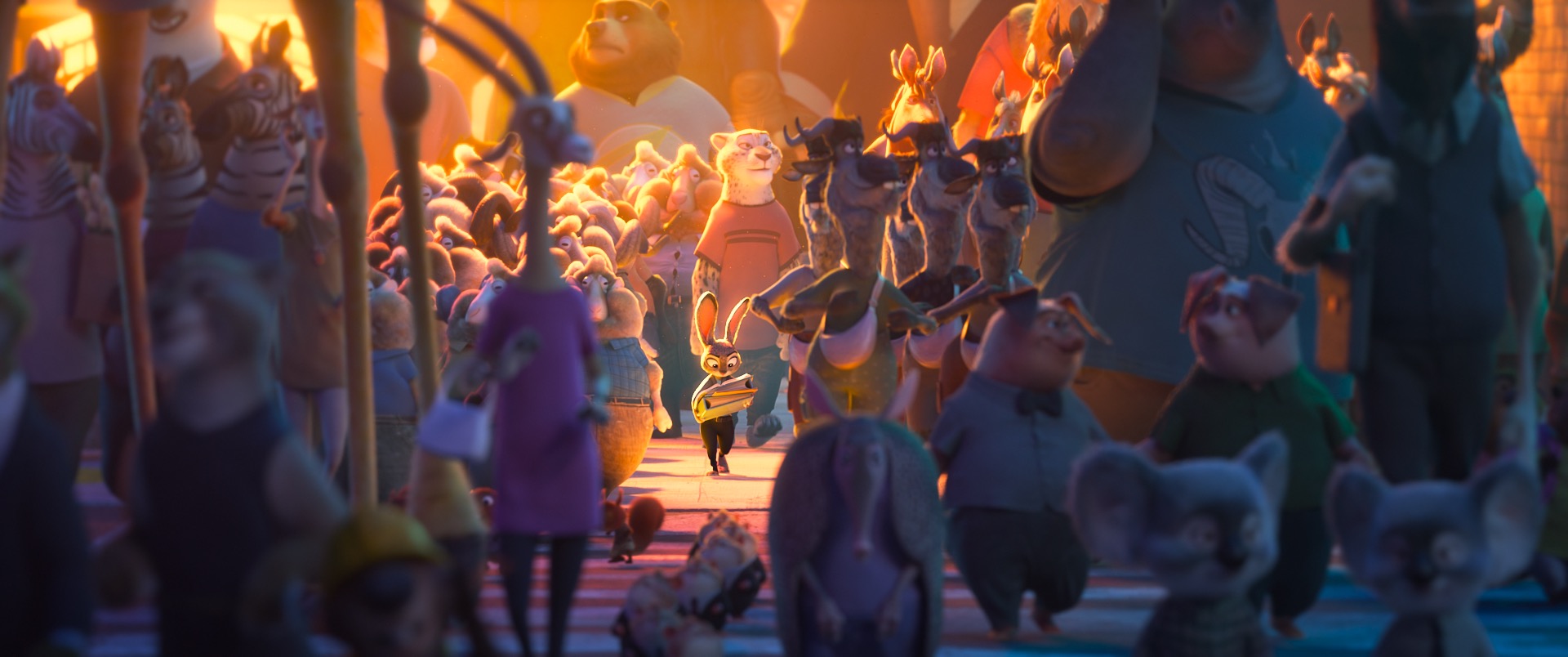 《疯狂动物城2》面临的核心技术挑战,本质上与前作如出一辙:细节与规模的平衡始终是核心命题[Burkhard et al. 2016]。《疯狂动物城》的世界极其精细且视觉丰富,这种细节必须在从微小鼩鼱到高耸长颈鹿的各种尺度上都保持完美。大多数角色覆盖着精细的毛发,由于故事背景设定在现代都市,镜头中可能同时出现数百甚至数千个角色,周围环绕着车辆、灯光以及城市中应有的无数道具和细节。影片几乎每个镜头都涉及复杂的模拟或特效处理,故事本身更带领观众穿梭于各种环境与光照场景,所有这些都需要我们以高效且协调的方式呈现。重温2016年版《疯狂动物城》时,我依然惊叹于每个画面中蕴含的惊人几何结构与阴影细节,而九年后的今天,我们的艺术家们已将这种表现力推向了新的高度。