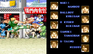 在贴图表0x4700(“肯的补丁区”)的0xC0处,可见一张非格斗角色的小型肖像。这实为开发团队的合影,他们在游戏结尾的制作名单中出现。值得注意的是,这些照片既非真实肖像也未使用真实姓名——此举很可能是为避免人才挖角。