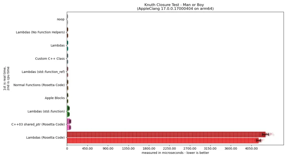 为衡量性能代价,我们将采用克努斯的“男子汉测试”,通过C/C++语言结合不同扩展特性,对闭包问题的多种实现风格进行基准测试。“男人还是男孩”测试能高效评估编程语言在深度递归与自我引用场景下处理特定实体的能力。它可对程序创建和传递函数调用相关数据的各个环节进行压力测试——若语言设计存在缺陷,导致无法引用变量或函数参数的具体实例,最终将产生错误结果并引发灾难性崩溃。