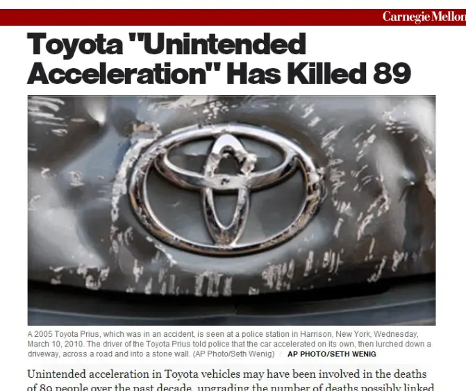 此事已过去数年,人们或许已淡忘。但当年丰田汽车确实因软件漏洞随机发生“意外加速”故障。